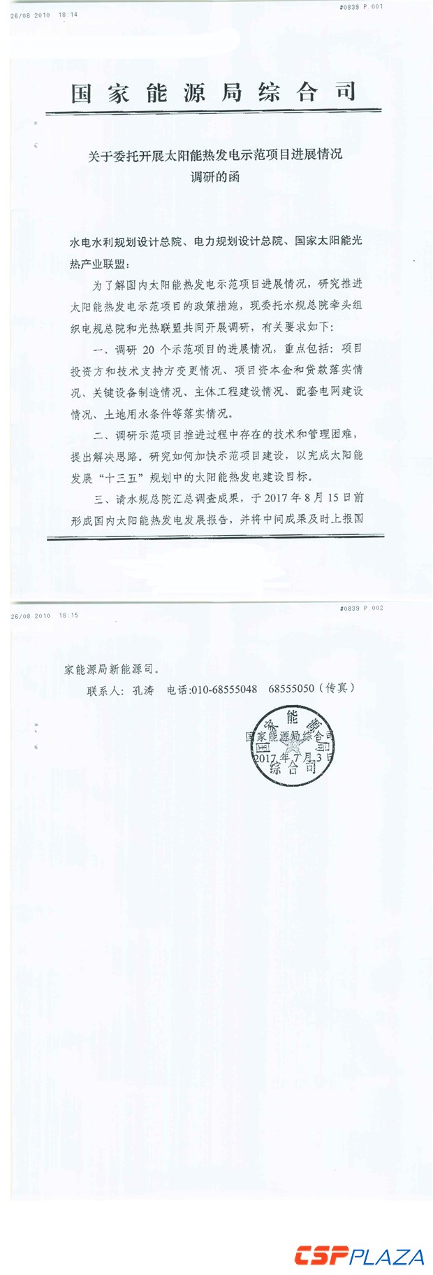 CSPPLAZA光熱發電網訊:近日,國家能源局綜合司下發了《關于委托開展太陽能熱發電示范項目進展情況調研的函》,要求水電水利規劃設計總院、電力規劃設計總院和國家光熱聯盟三單位對中國首批20個太陽能熱發電示范項目的建設進展情況進行調研。