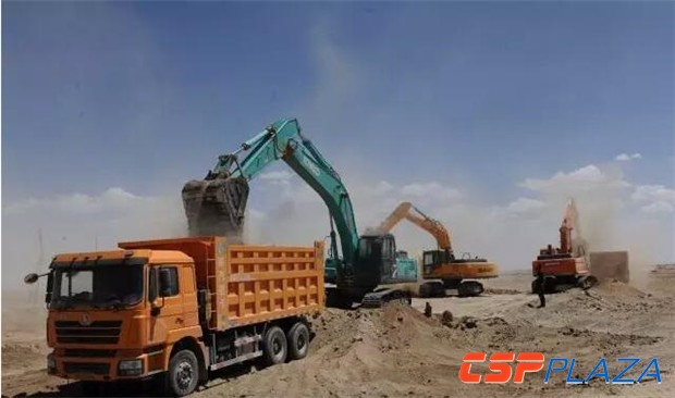 這幾天,阿克塞縣境內出現了高溫酷熱天氣,縣城境內最高氣溫達到38度以上,地面溫度達到了72.5度。在當金山南,甘肅光熱阿克塞四十里戈壁50兆瓦槽式高溫熔鹽光熱并網發電項目建設現場,中午時分的天氣異常干熱,刮起風來更是漫天塵土,悶熱難耐且能見度極低。7月11日中午,工人們吃過午飯稍作休息后,便趕往工地開始工作,大家在高海拔地區抗風沙、冒酷暑對挖掘機、貨車等進行保養檢修后,擼起袖子大干起來,數十臺挖掘機在建設場地間隆隆作響,將挖起的砂石料一斗一斗裝進車廂,裝滿砂石料的貨車來來往往,不停的將砂石料拉運到目的地。